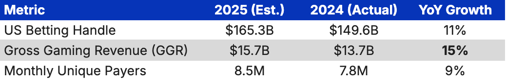 US betting handle: 2024 actual (source). 2025: $113B between Jan-Sept (source), $17.8B in October (source). Jan-Oct handle was 79.3% of total 2024 handle. Assuming the same ratio and seasonality for 2025, estimated total handle is $165.3B.