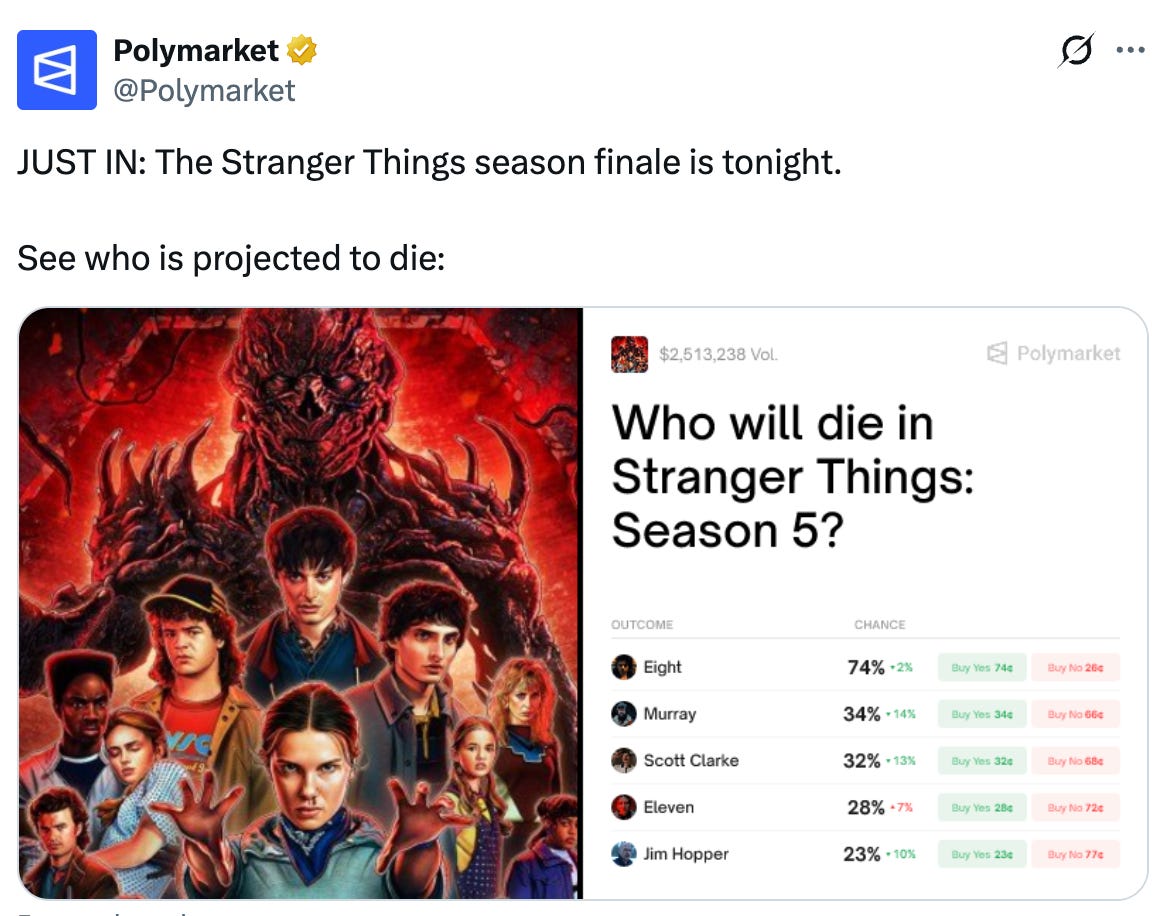 Nothing was too trivial to bet on. Polymarket and Kalshi used the all-caps “BREAKING:…” news format to post about the most inane things like celebrity gossip: