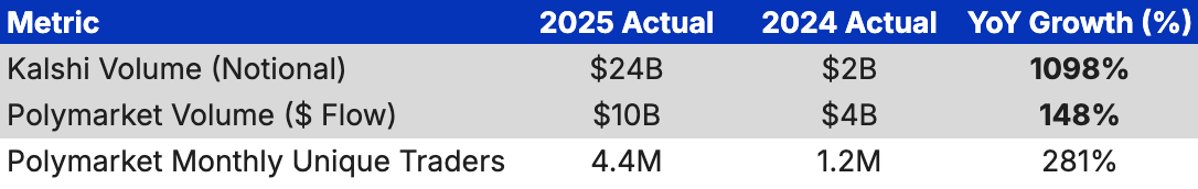 The 2024 election market attracted over $4 billion in volume between Polymarket and Kalshi, and they leveraged this success to go big in 2025. Polymarket got a CFTC license through the acquisition of the derivatives exchange QCEX, which let them finally launch in the US. Kalshi and Polymarket are being integrated with major exchanges (Coinbase, Robinhood), wallets (Phantom, MetaMask), and media platforms (CNN, CNBC). “What’s the Polymarket at?” became a common phrase used by mainstream celebrities like Joe Rogan and Elon Musk.