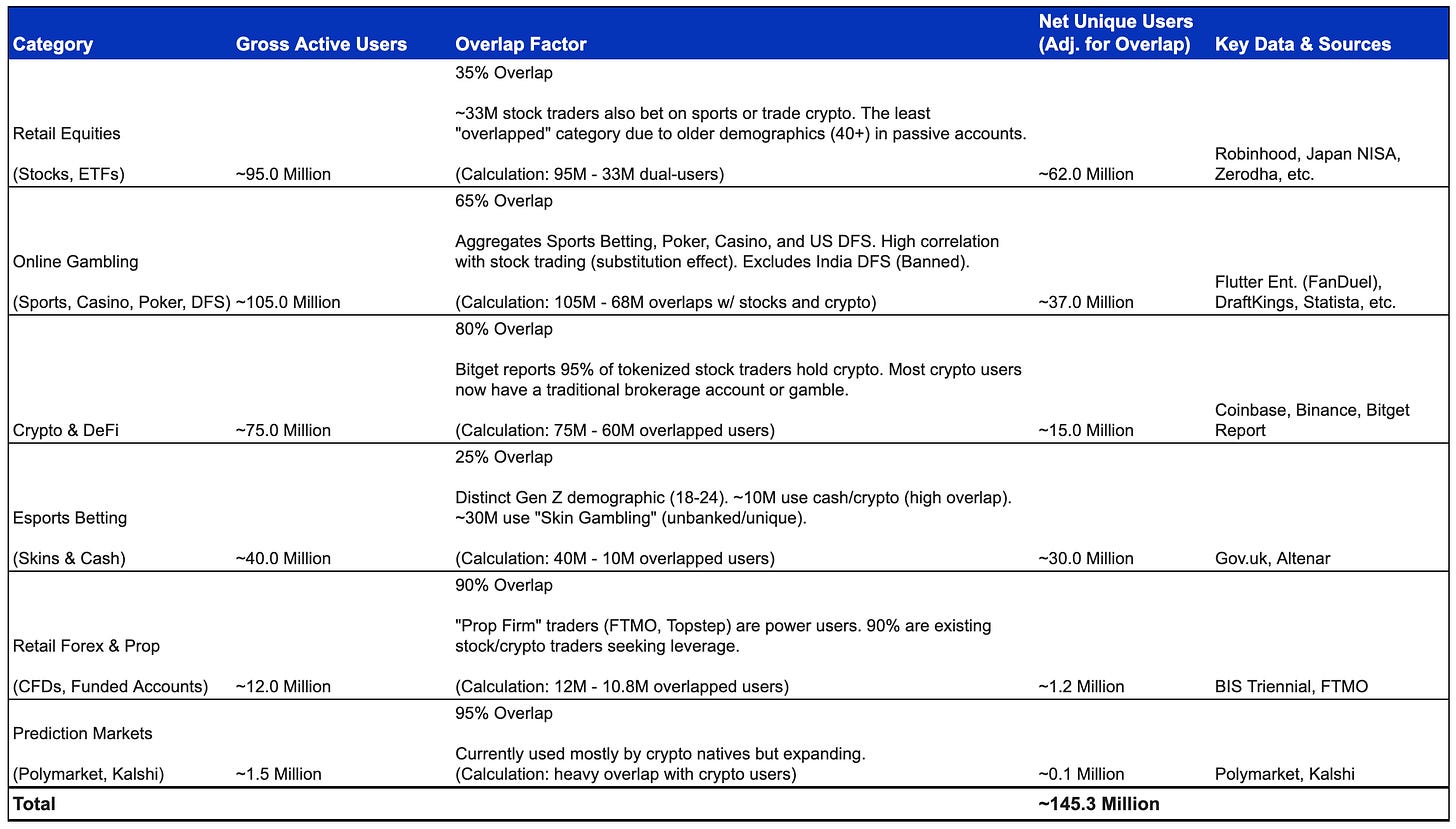 It is difficult to accurately estimate the number of monthly active traders globally, but I attempted to do a rough estimate. The table below accounts for major categories of speculation and adjusts for overlapping users, e.g. there is a high overlap between online gambling users and those who trade stocks and crypto. The numerical precision shouldn’t be taken as seriously, but it is fair to say there are at least 100 million monthly active traders.