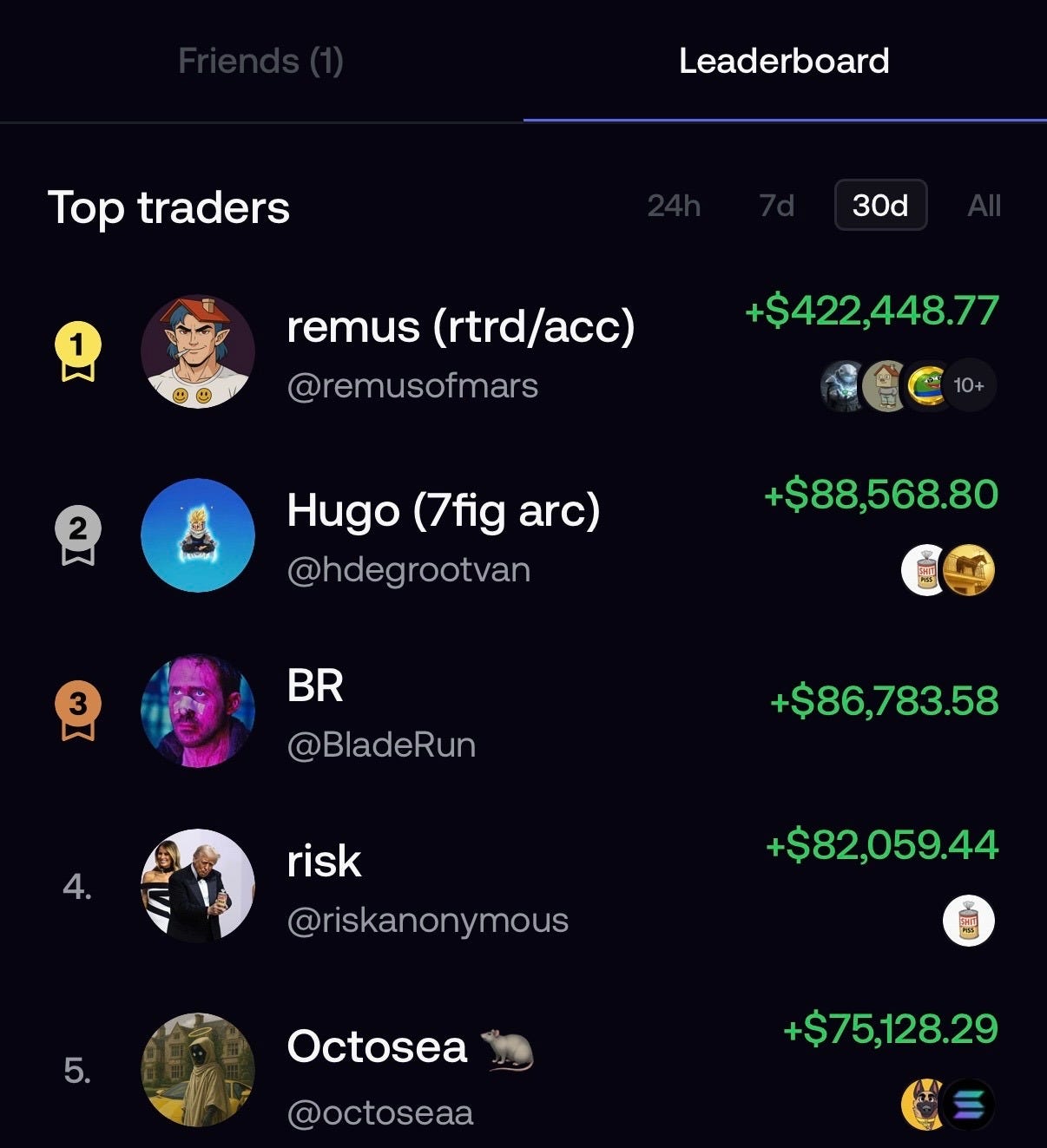 The Fomo leaderboard shows the exact amount of money traders have made over the past day, week, and month, in an effort to induce fomo to trade, as the name suggests. Top traders become instantly well-known; Remus has made the most money over the past month, so he is the latest celebrity trader. The old model on social media was: build a following first, monetize later. The new model is: make money first, and the audience will find you. Positive P&L mints clout.