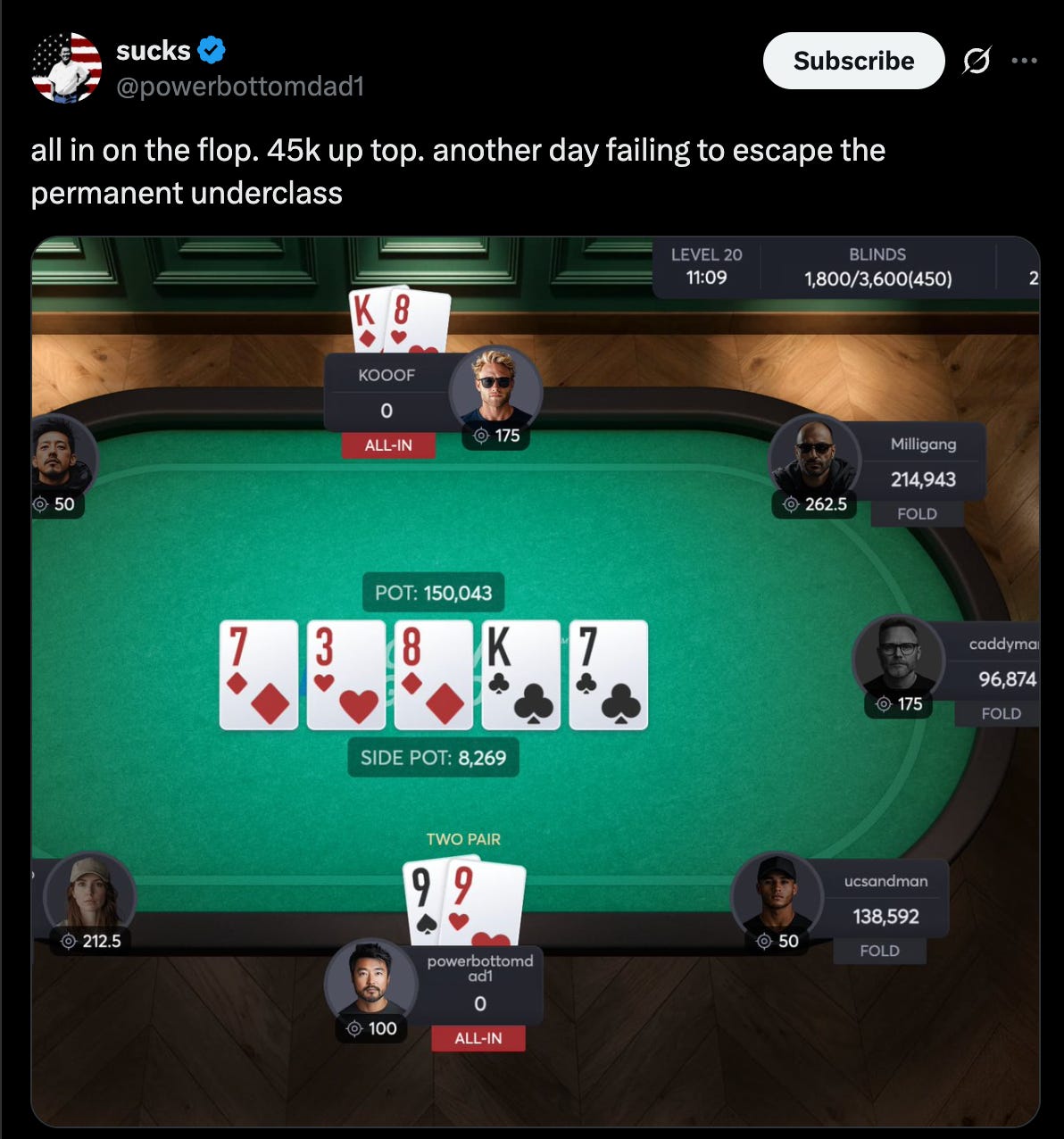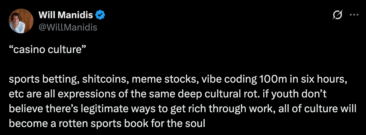 People have a lot of explanations for why the world is now gambling. Financial nihilism, rising housing prices, a feeling like people can’t escape the underclass with labor, wage growth stagnation, lack of community, cultural rot, among others.