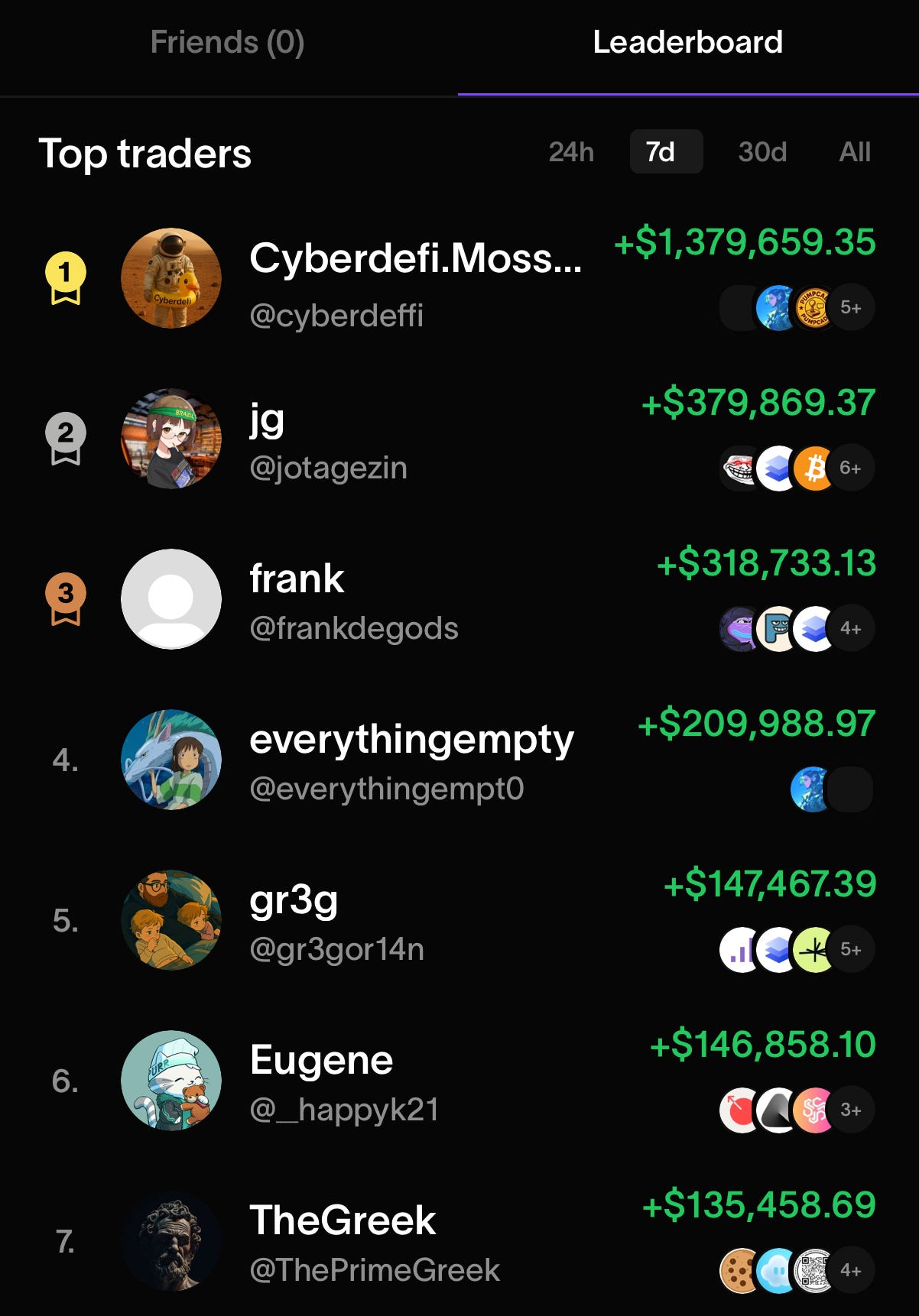 Apps like Hyperliquid, Bullpen, Clicker, and Farcaster have leaderboards of top traders and news feeds of their trades so you can copy them. Robinhood introduced its social feature to follow your favorite traders, show off your recent gains, and copy trades. The crypto version of one-click checkout is one-click copy-trade.