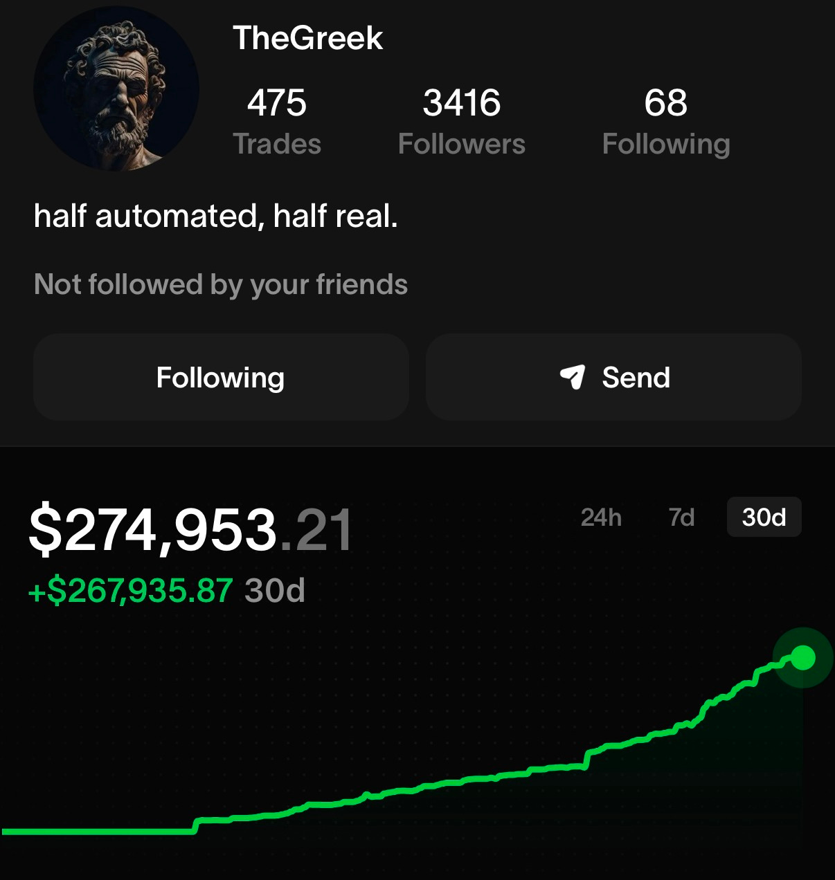 Products are now being built to surface the best traders to the public early. Anonymous trader ThePrimeGreek started with $6,000 on the social trading app Fomo and made $268,000 in 30 days. He gained 3,000 followers on Fomo and many requested him to create a Twitter account to share his takes.