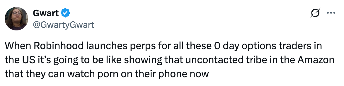 Zero day options rose from 5% of total options volume in 2016 to 61% by May 2025. Retail share of zero day options volume is a staggering 54%. Zero day options have low premiums and provide a lottery-like payoff since small moves in the underlying asset produce outsized P&L. You can also tie your bet to specific catalysts or events, which are easy to digest on social media. Speculation on whether “Trump will announce a new round of tariffs on China” or “Powell will cut rates” can help people craft a story on why their lottery ticket is a sound investment.
